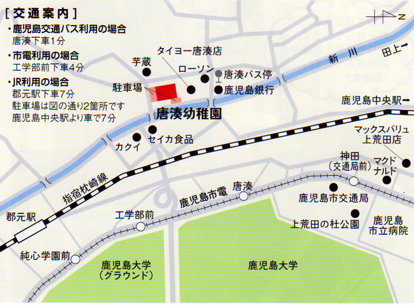 唐湊幼稚園は新川をはさんで、鹿児島セイカ(ボンタンアメ)会社の山手側にあります。